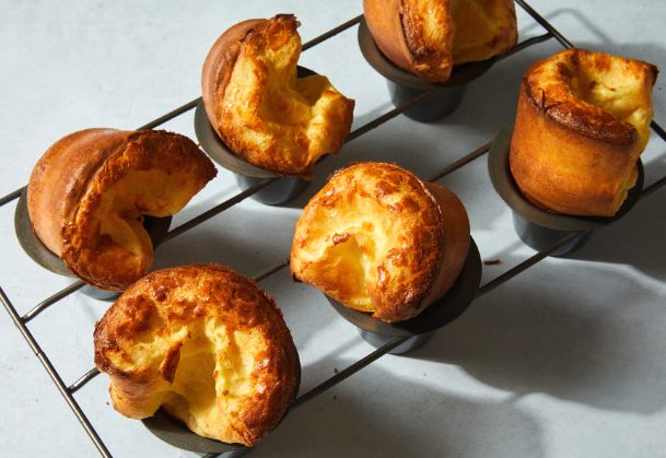 Using a popover pan will give you a taller result. But if you don’t have one, you can use a 12-cup muffin tin.